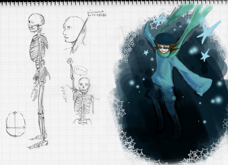 ようし!ちゃんと基礎とかしよう!と思って挫折しました。 気が付いたら全然違うのかいてた、です。 骸骨こわいです。筋肉とかこわいです。 もっと…なんかリアルじゃないのにすればよかった… ちゃんと中身が入ってそうな人間描きたいです… |